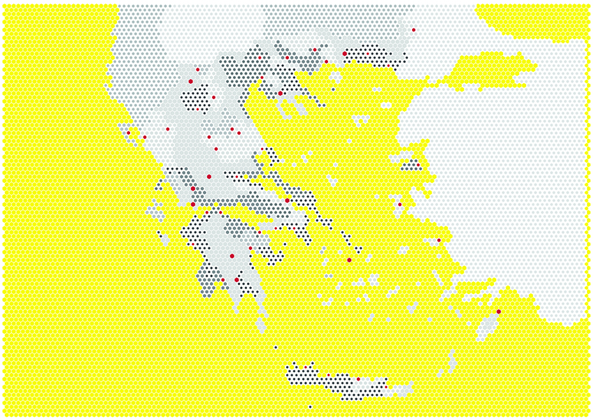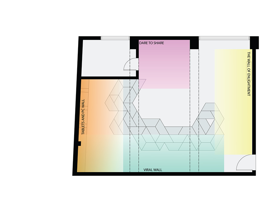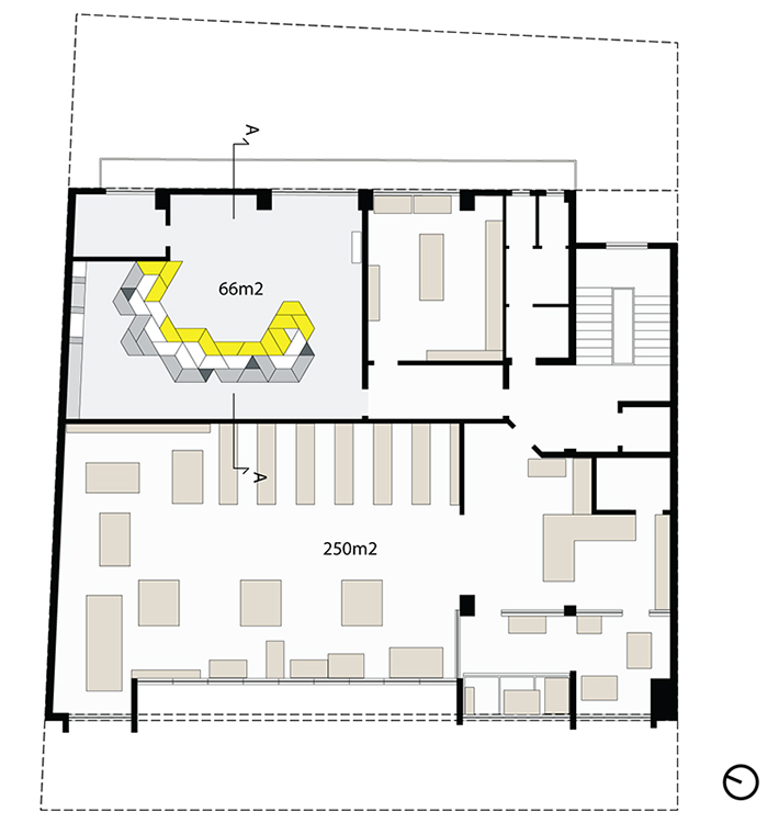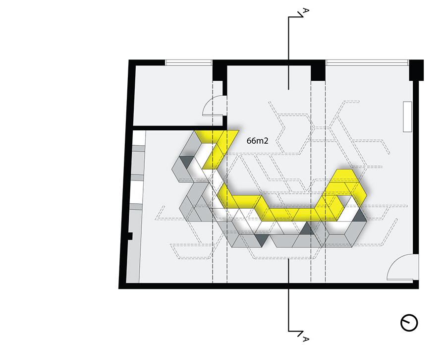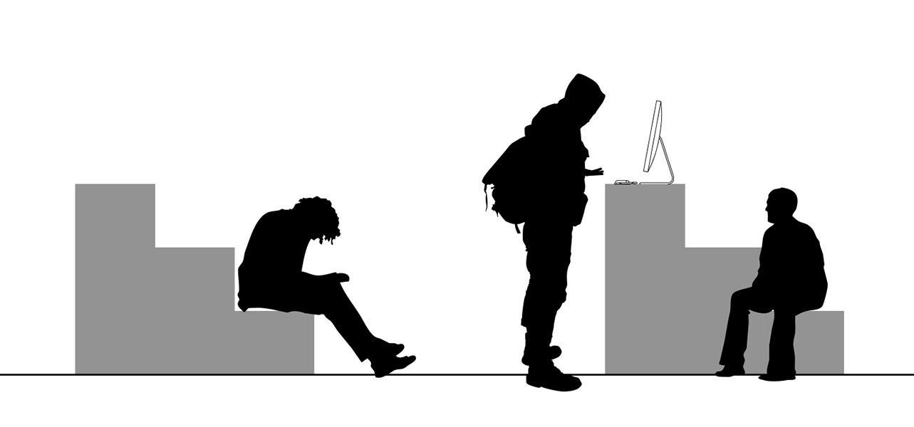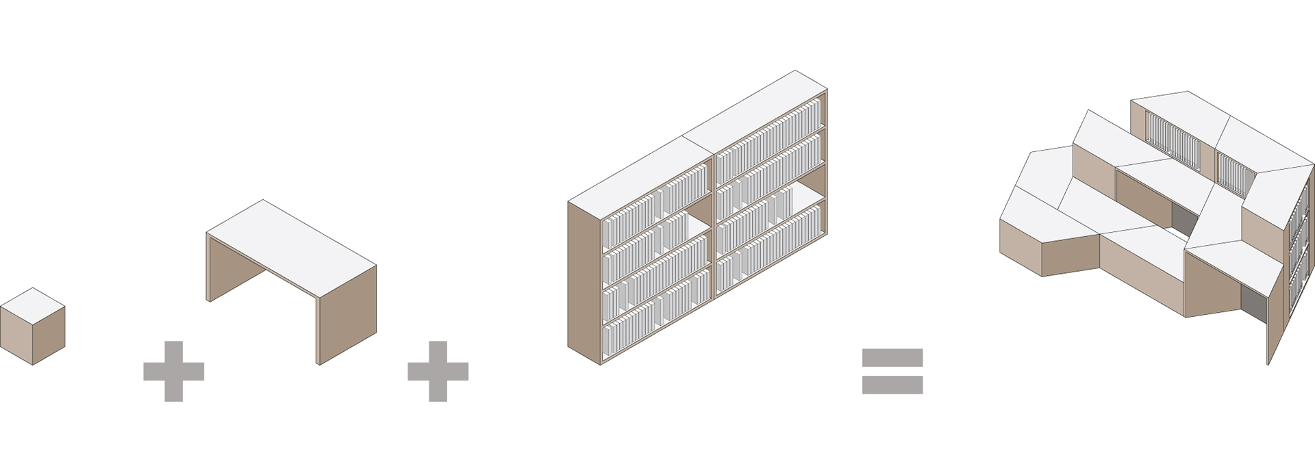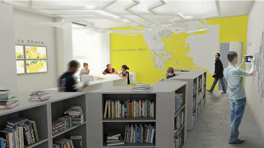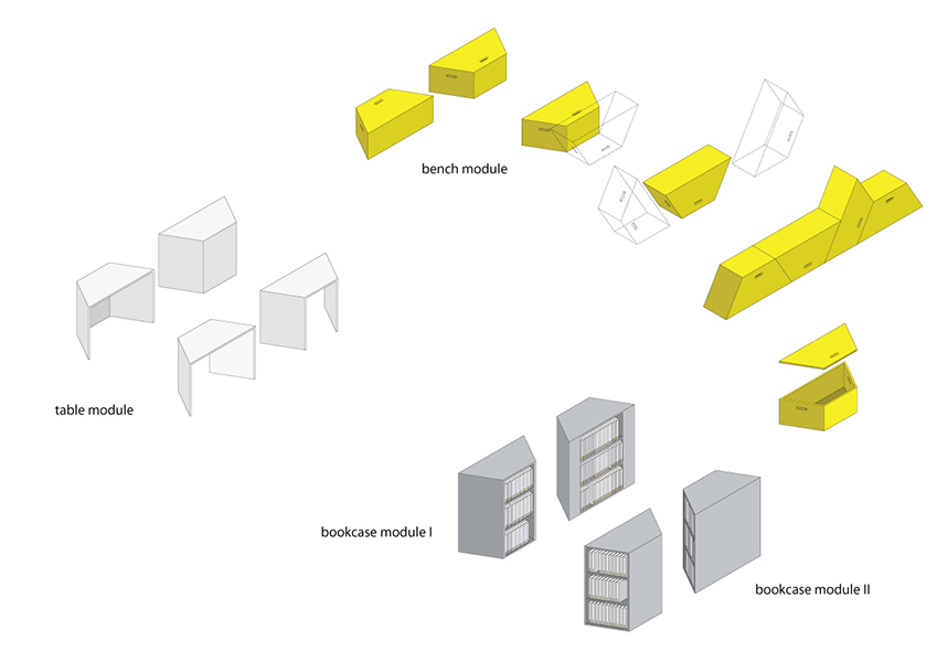 The proposition focuses on the concept of the community. The main installation is Kerkis, an amphitheatrical structure. The amphitheater is the par excellence symbol of social gathering. Another reference is the impromptu stoop seating that takes place in public spaces. The proposal aims to introduce an atmosphere of public open space into the libraries. Kerkis is formed by three modules that are repeated in space. It borrows the hexagonal form of the honeycomb which is the par excellence symbol of symbiosis in nature. Alongside its conceptual role the repetition of the elements has some practical characteristics that make it exceptionally flexible. Kerkis can take numerous forms and can be easily redesigned to fit in different spaces. The transformation of the installation engages the users in the creation of their own space, reinforcing the concept of the community.