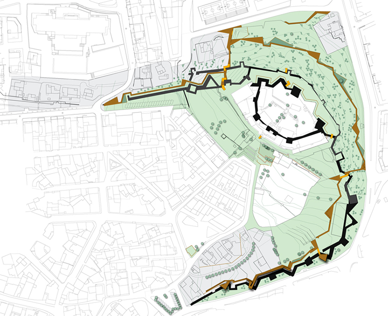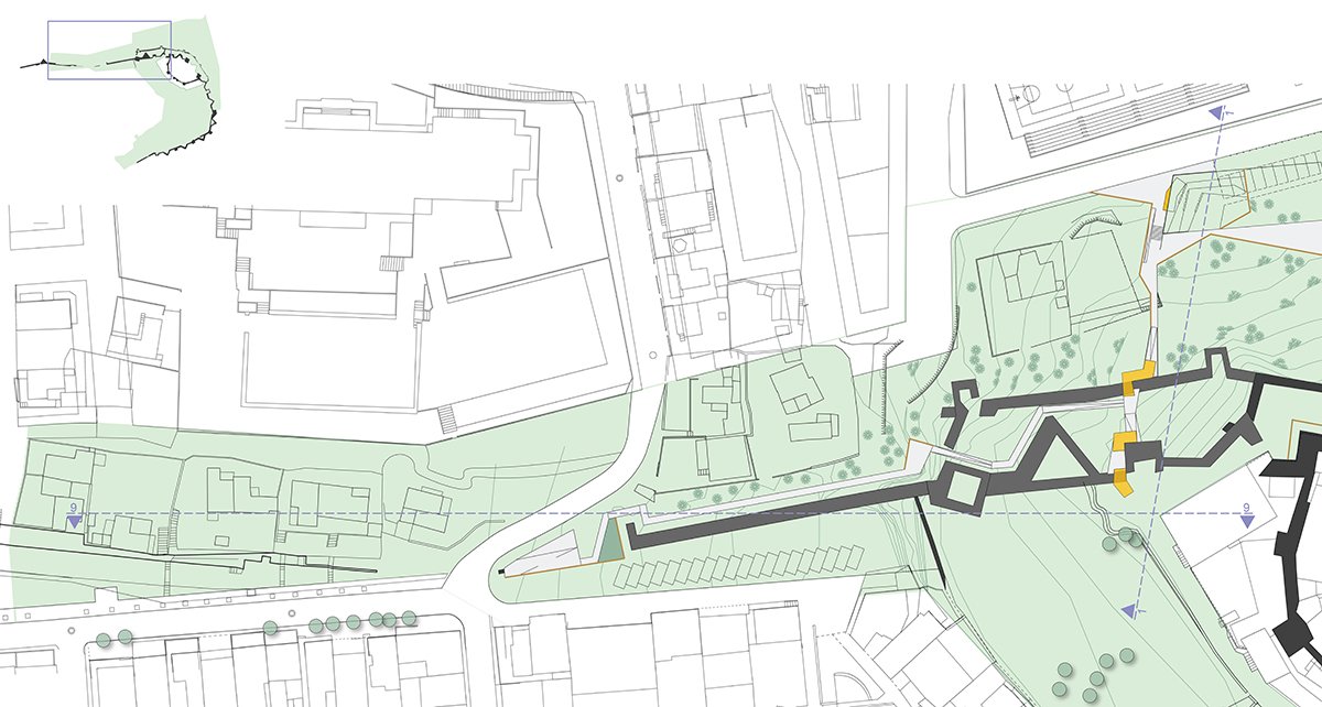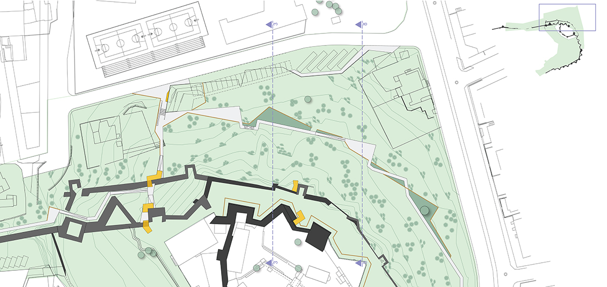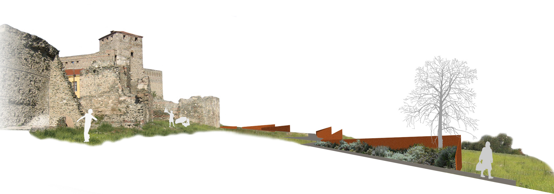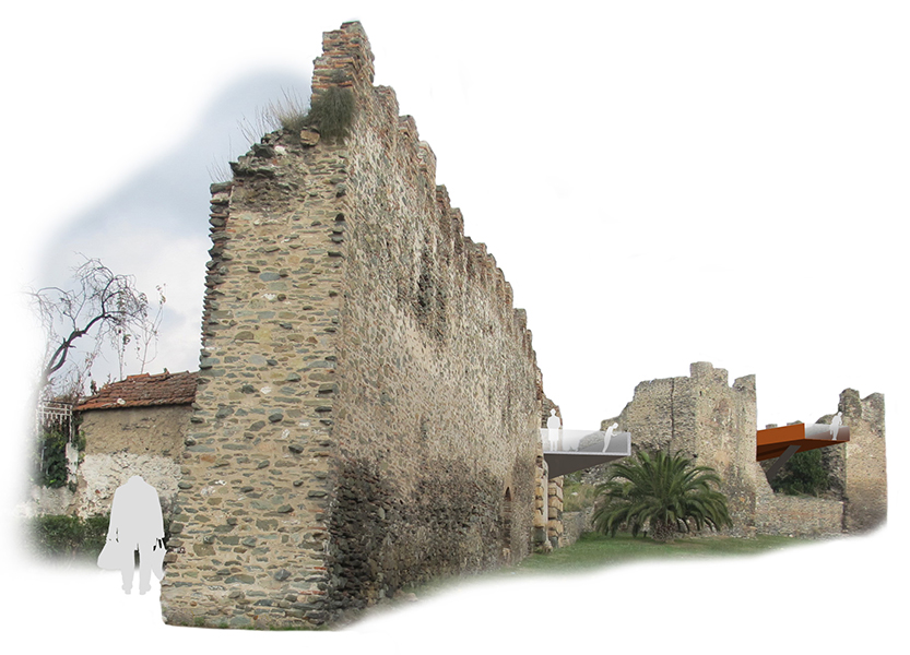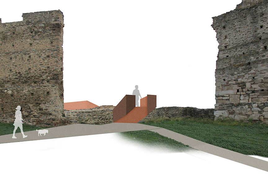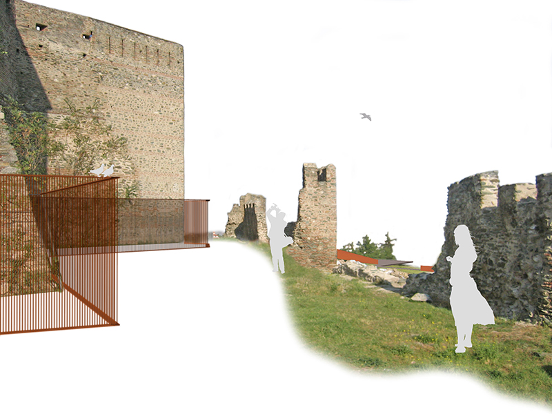 The design was based on the desire of interactivity with the monumental character of Eptapyrgio with a minimum of interventions on site. The solution is a circular pathway, called the necklace, that leads the pedestrian around Eptapyrgio and its walls. Going in and out of the exterior walls, the pathway connects the ancient prison with its surroundings. The interest points are highlighted with plateaus or balconies offering a view on the city. The construction is made of concrete, corten steel and glass, and is completed by a range of low-height, self-maintained vegetation inspired of the byzantine era flora.